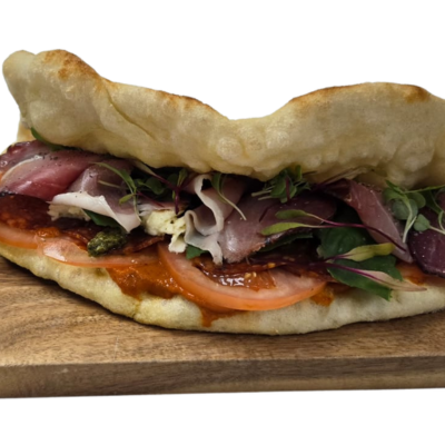 - Drizzle with basil pesto, sundried tomato pesto, olive oil & balsamic Vinegar, season with salt & pepper, close sandwich & enjoy.