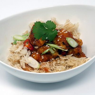 - Once the cauliflower is cooked, toss it in with the chilli sauce, place it onto a bed of rice, and garnish with chillies, sesame seeds and spring onions.