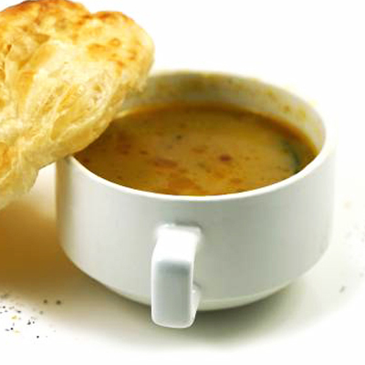 - Take the lamb out and cut the meat in equal cubes, strain the soup, bring the meat back to soup, season it with salt and pepper and chill it. Pour a portion (220 ml/7.5 oz/fl) cold soup with parsley and fried onions into a soup cup and cover it with the frozen paratha.